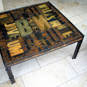Tischfläche aus antiken hölzernen Druckbuchstaben,